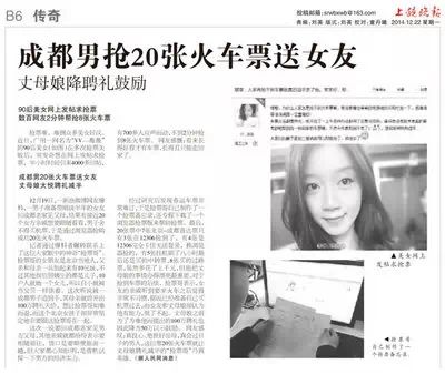 【事件回放】12月19日,一则《成都男20张火车票送女友 丈母娘一开心聘礼只要50万》的新闻在网络走红。文中称,一男子准备带刚谈半年的女友回成都老家见父母,结果有接近20个女方亲戚想要跟随,于是“抢票哥”用某浏览器成功抢购20张火车票,丈母娘看到后感觉非常开心,原本曾故意为难他所要的100万聘礼也因此降为50万的标准。