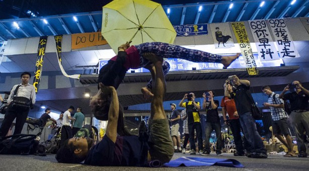 示威者在金钟玩起杂耍,哗众取宠。图片来源:法新社