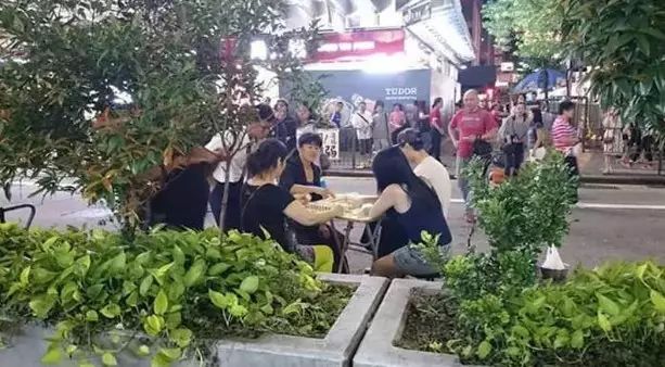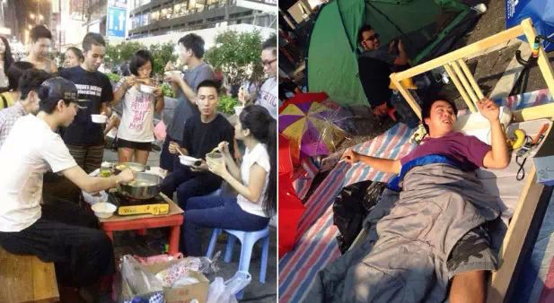 被示威者占领的弥敦道,入夜后仿若嘉年华,有吃有玩。上图右为“占中”示威者索性搬来床铺堵塞在马路中央,抽烟消遣。网上图片