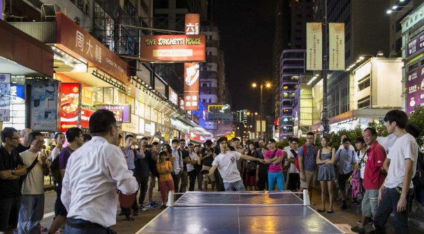 “占中”示威者在旺角“占领区”架起乒乓球台,玩得不亦乐乎。图片来源:路透社