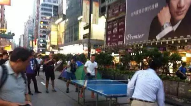 “占中”示威者在旺角“占领区”架起乒乓球台,玩得不亦乐乎。网上图片
