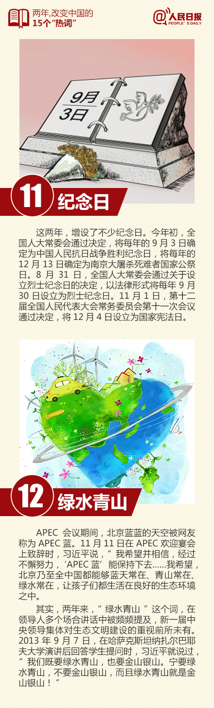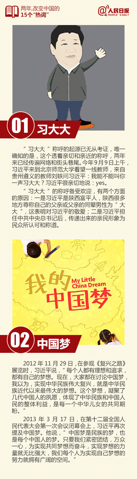 习大大、中国梦、“拍蝇打虎”、八项规定……这些词是不是越来越多地出现在媒体上、网络上?今天,以习近平为总书记的新一届中央领导集体履职满两年。这两年里,不少“热词”被口口相传,见证着新一届中央领导集体的努力与自信,也映照出这个时代的光荣与梦想。戳图,重温!